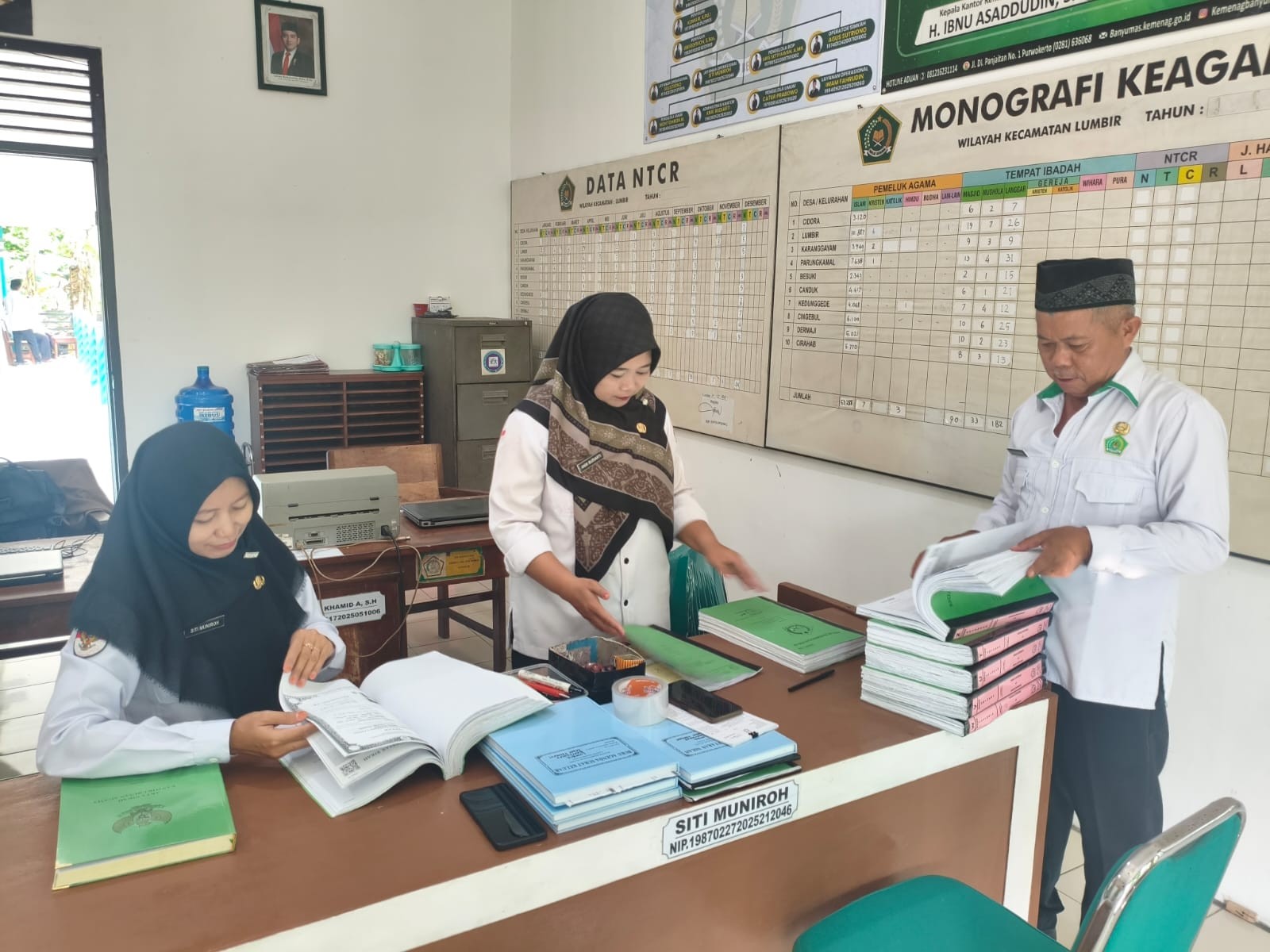Hal inilah yang dengan penuh kesadaran dan tanggung jawab dilakukan oleh jajaran staf KUA Lumbir. Dalam upaya menjaga ketertiban administrasi dan memastikan keamanan dokumen, para staf melaksanakan kegiatan penjilidan arsip berkas-berkas nikah yang telah selesai diproses. Berkas-berkas tersebut dikumpulkan, disusun sesuai urutan tanggal dan nomor register, diperiksa kembali kelengkapannya, kemudian dijilid agar tersimpan dengan aman dan mudah ditelusuri kembali ketika sewaktu-waktu diperlukan.