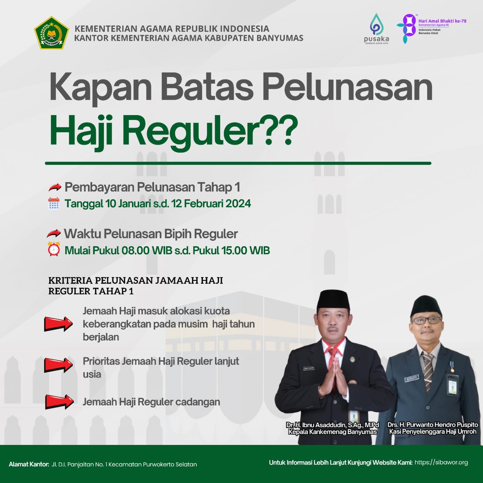 Purwokerto (Humas)- Pemerintah melalui Ditjen Penyelenggaraan Haji dan Umrah (PHU) Kementerian Agama, mengumumkan bahwa calon jamaah haji Indonesia masa pemberangkatan 1445 H/ 2024 M sudah bisa melakukan pelunasan Bipih jamaah haji reguler yang dimulai pada 10 Januari - 12 Februari 2024.