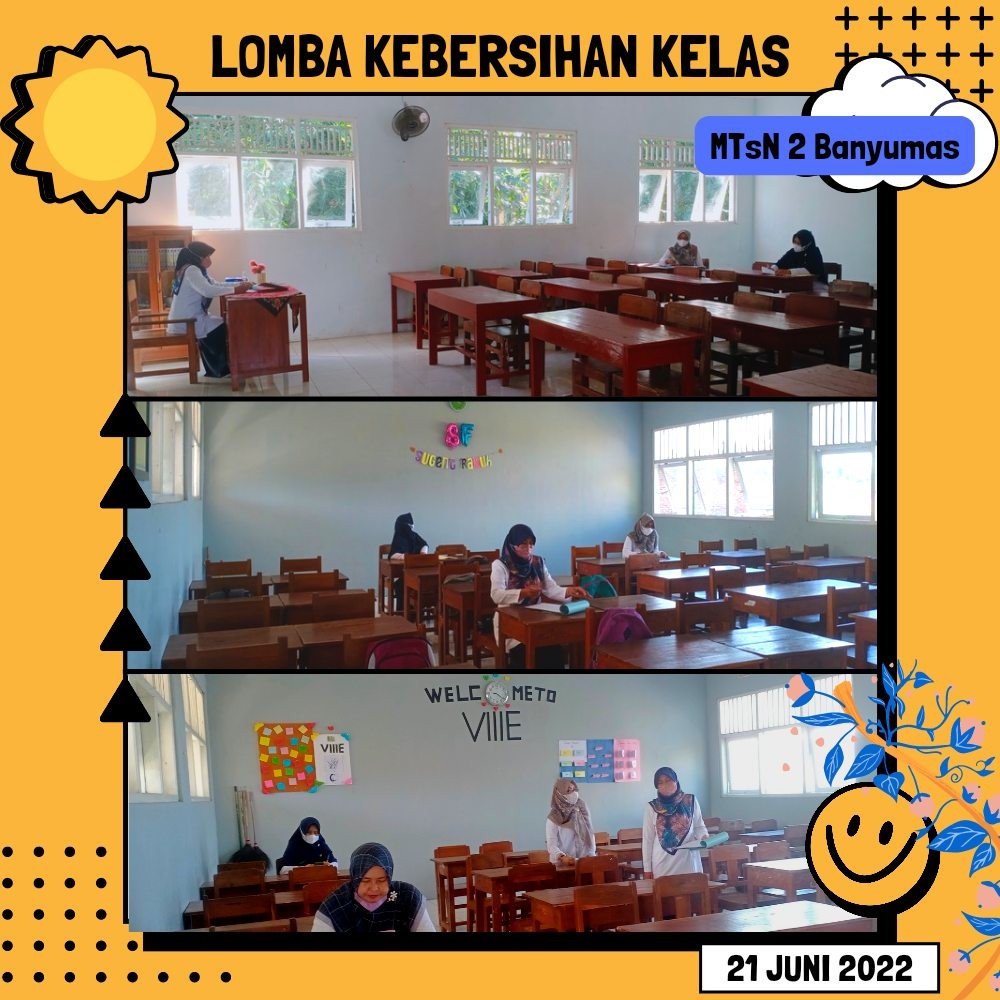 Banyumas - Kegiatan Classmeeting agenda ketiga yang dilaksanakan MTsN 2 Banyumas dengan mengadakan kegiatan lomba kebersihan kelas. Kebersihan yang dilaksanakan meliputi kebersihan ruangan kelas dan luar kelas pada hari Selasa (21/06/22). Kebersihan dilakukan oleh seluruh pesdik MTsN 2 Banyumas. Hal ini dimaksudkan agar seluruh ruangan yang akan dipakai untuk kegiatan penerimaan rapor dan menjelang libur akhir tahun ajaran dalam keadaan bersih, indah, dan rapi.