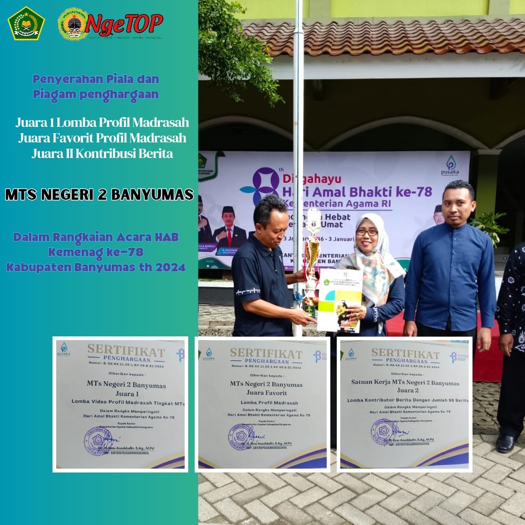 Penyerahan piagam penghargaan dilaksanakan di Kementerian Agama Kabupaten Banyumas, Rabu, 3 Januari 2024. Diterima langsung oleh Kepala MTsN 2 Banyumas, Atik Restusari, S. Pd., M. Pd. Dengan rasa bangga dan bahagia Atik menyampaikan bahwa, "Saya sangat bersyukur dan berterima kasih kepada semua pihak yang terkait atas prestasi yang diraih yaitu sebagai juara 1 sekaligus juara favorit pada vidio profil madrasah tingkat MTs. Saya berharap semoga kedepannya MTsN 2 Banyumas bisa mempertahankan prestasi ini dan terus bisa meningkatkan pada bidang-bidang lain agar MTsN 2 Banyumas semangkin NgeTop" papar Atik
