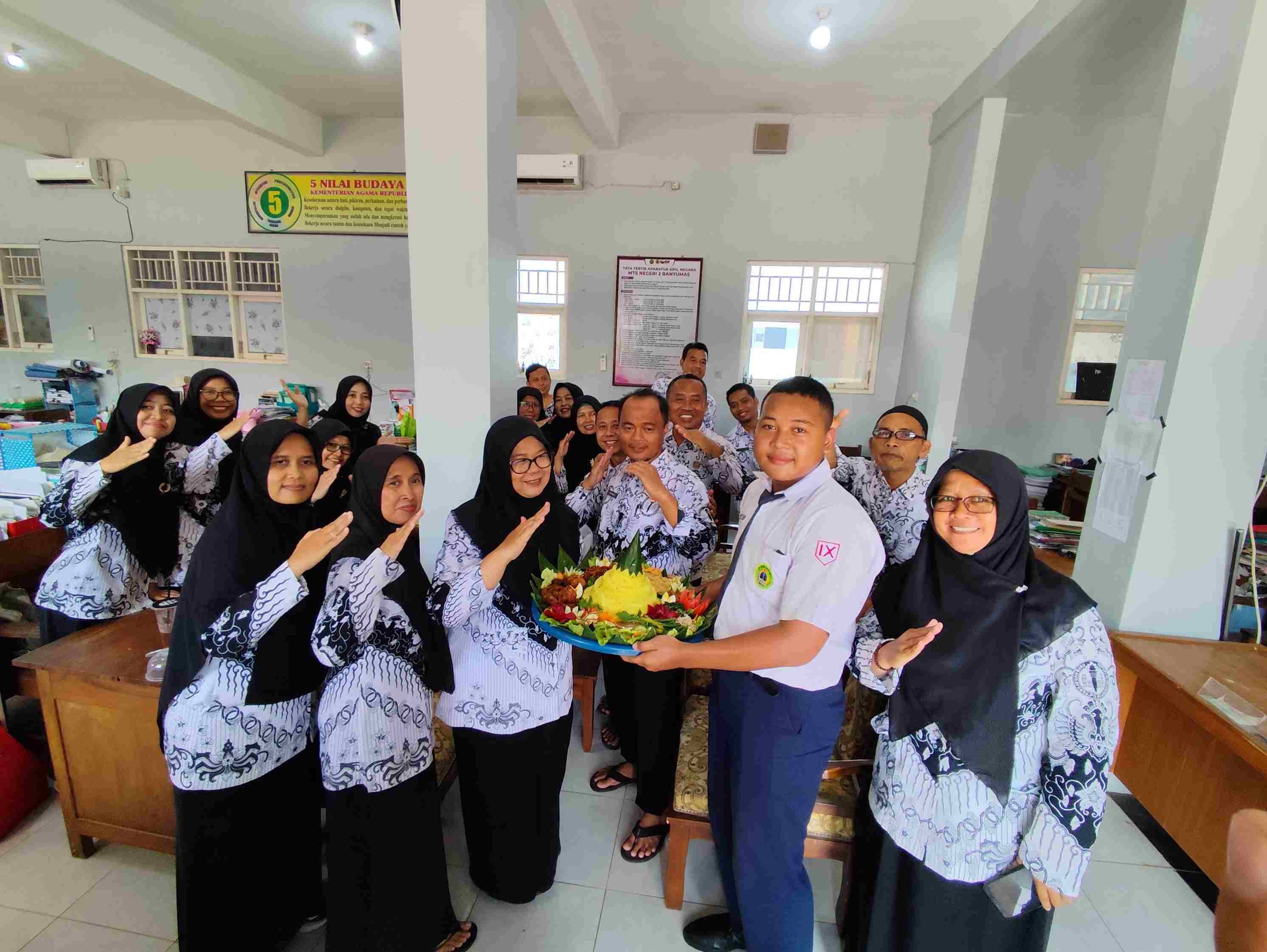 Banyumas (Humas) - Suasana haru dan penuh keakraban menyelimuti kantor guru MTs Negeri 2 Banyumas pada perayaan Hari Guru Nasional yang jatuh setiap tanggal 25 November. Sebagai bentuk rasa terima kasih dan penghormatan atas jasa-jasa para pendidik, Pengurus Organisasi Siswa Intra Sekolah (OSIS) MTsN 2 Banyumas memberikan kejutan istimewa berupa tumpeng lengkap. Selasa (25/11)