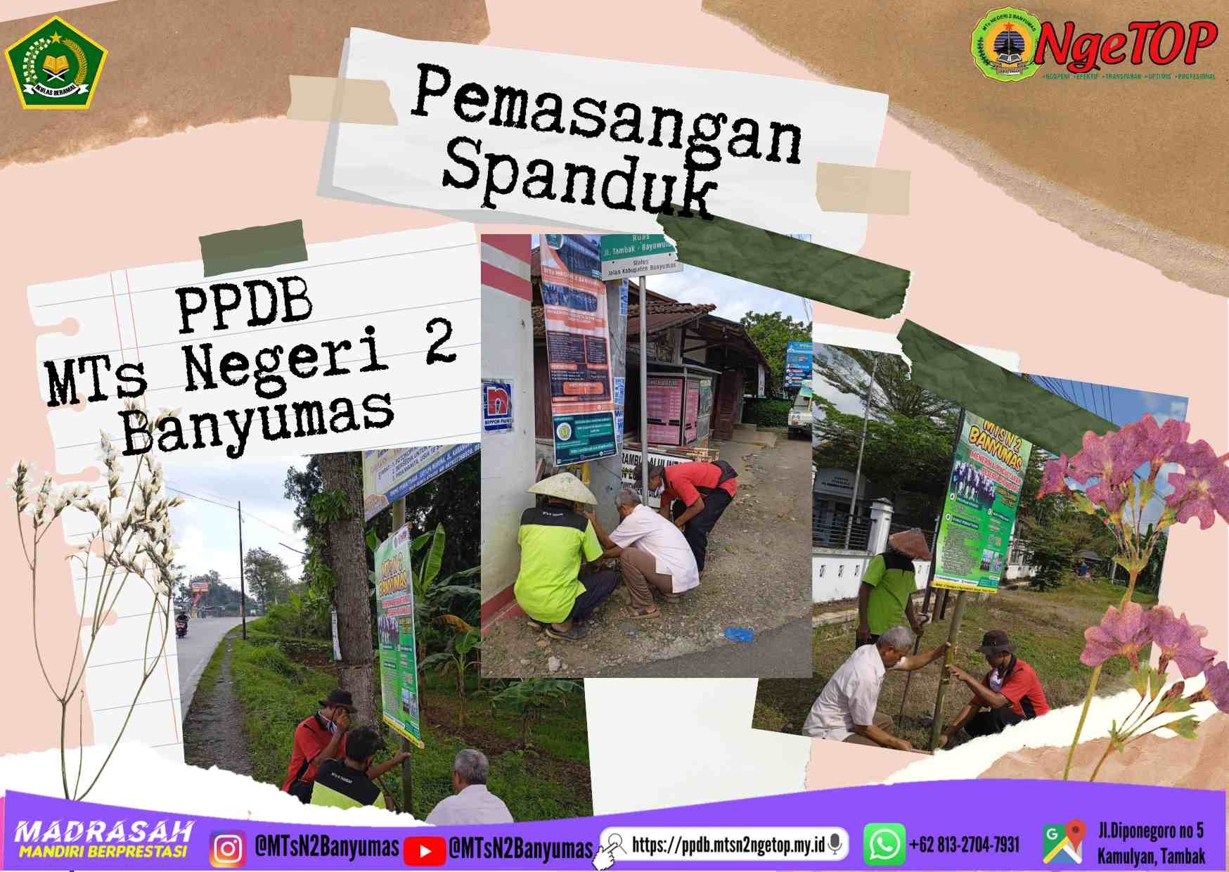 Banyumas – Menjelang tahun ajaran baru banyak cara dan strategi untuk menggaet peserta didik baru, salah satunya yakni dengan mensosialisasikan Penerimaan Peserta Didik Baru (PPDB) melalui media spanduk seperti yang dilakukan panitia PPDB MTsN 2 Banyumas. Pemasangan spanduk selain di depan gerbang madrasah juga di tempat-tempat yang strategis di beberapa desa terdekat serta melalui brosur yang dibagikan ke SD/MI yang ada di Kecamatan Tambak dan sekitarnya selain melalui media online (WA, Facebooks, IG,Website).