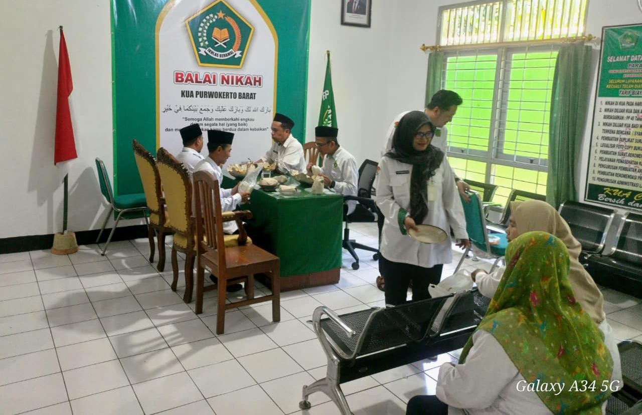 Banyumas – Dalam rangka mempererat kebersamaan dan meningkatkan kekompakan antar pegawai, segenap pegawai KUA Purwokerto Barat melaksanakan kegiatan makan siang bersama di ruang balai nikah KUA Purwokerto Barat. Kegiatan yang berlangsung dalam suasana santai dan penuh keakraban ini diikuti oleh seluruh pegawai, baik penghulu, penyuluh agama, maupun staf administrasi. Momen makan siang bersama ini menjadi sarana untuk mempererat hubungan kekeluargaan di lingkungan kerja, sekaligus melepas penat di jam istirahat setelah menjalankan berbagai tugas pelayanan sejak pagi. Senin (13/04)