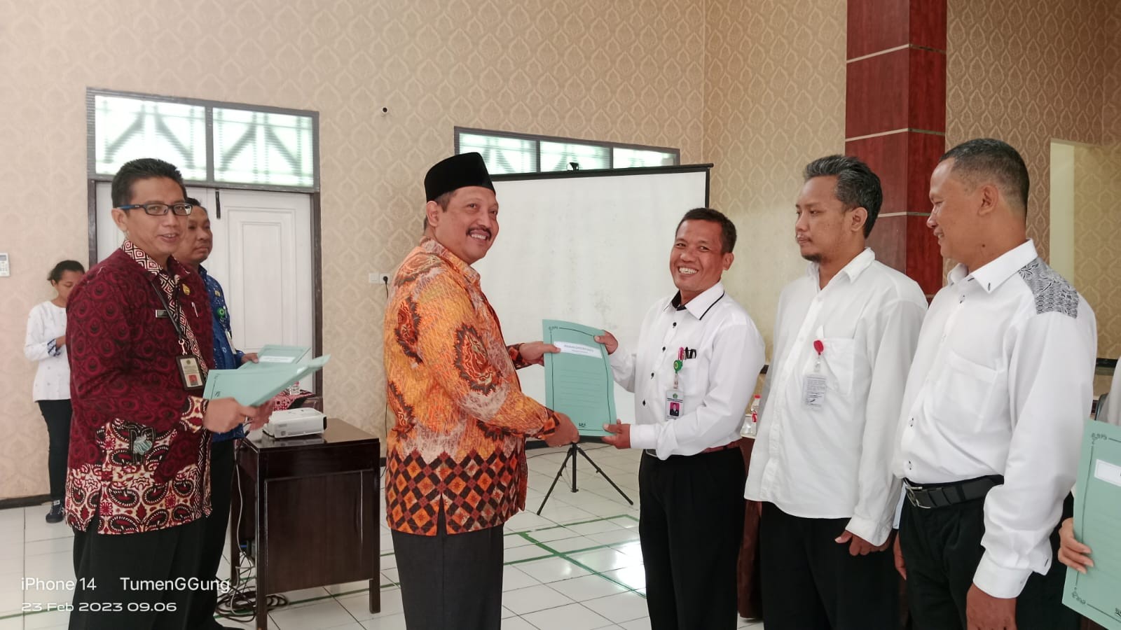 Purwokerto : Didampingi Kasubag TU H. Muhammad Wahyu Fauzi Aziz dan Penyelenggara Kristen wahyu Ibnugroho , Kepala Kantor Kementerian Agama Kabupaten Banyumas H, Aziz Muslim, menyerahkan Surat keputusan dari Kantor Wilayah Kemenag Jateng bagi 10 penyuluh agama Kristen se Kabupaten Banyumas, di Aula Al Ikhlas. Kamis (23/02).