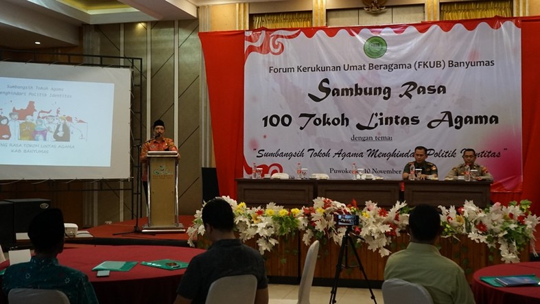Oleh HUMASPurwokerto : Forum Kerukunan Umat Agama (FKUB) Kabupaten Banyumas menggelar kegiatan Sambung Rasa 100 Tokoh Lintas Agama dengan tema Sumbangsih Tokoh Agama Menghindari Politik Identitas , di De Garden Resto Purwokerto. Kamis (10/11)