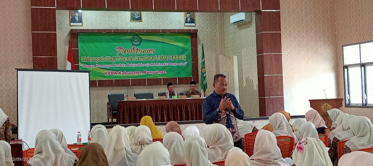 Purwokerto (Humas) - KKRA Raudlatul Athfal Kabupaten Banyumas menyelenggarakan pembinaan bagi Kepala Raudlatul Athfal se Kabupaten Banyumas. Kegiatan yang bertema Dengan Semangat Merdeka Belajar Menuju RA Mandiri Berprestasi , digelar di aula Al Ikhlas Kantor Kemenag Kabupaten Banyumas dihadiri oleh 175 peserta. Rabu (20/09)