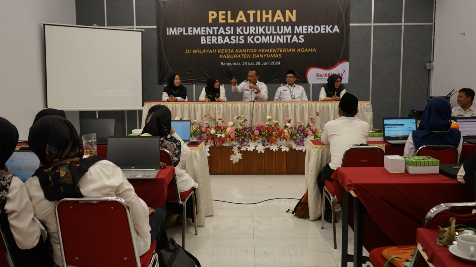 Purwokerto (Humas) - Kepala Kantor Kementerian Agama Kabupaten Banyumas Ibnu Asaddudin didampingi Plh Kasi Pendma M Wahyu Fauzi Aziz dan Widya Iswara membuka kegiatan Pelatihan Implementasi Kurikulum Merdeka Berbasis Komunitas (IKMBK) Tahun 2024 yang diadakan oleh Balai Diklat Keagamàn Semarang bertempat di De Garden Resto Purwokerto. Senin (24/06)