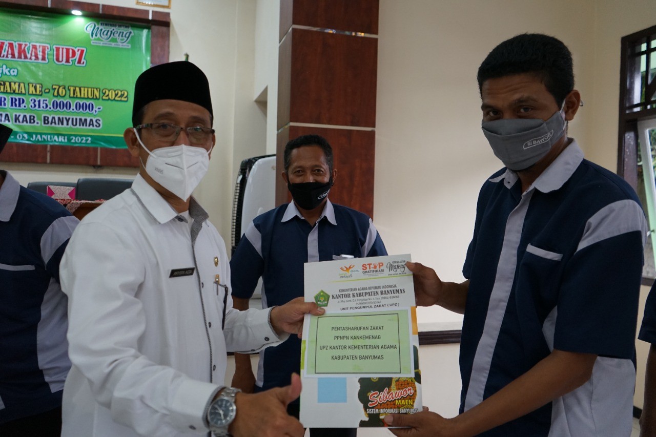 Purwokerto : Kepala Kantor Kemenag Kabupaten Banyumas Drs.H.Akhsin Aedi, M.Ag didampingi Kasubag TU Ibnu Asaddudin, S.Ag, M.Pd , Kasi , Gara, Ketua Dharma Wanita Persatuan (DWP) Kemenag Banyumas, Ketua UPZ kantor Kemenag Banyumas menggelar pentasyarufan zakat bagi 540 mustahik bertempat di Aula Al Ikhlas, Kamis (30/12).