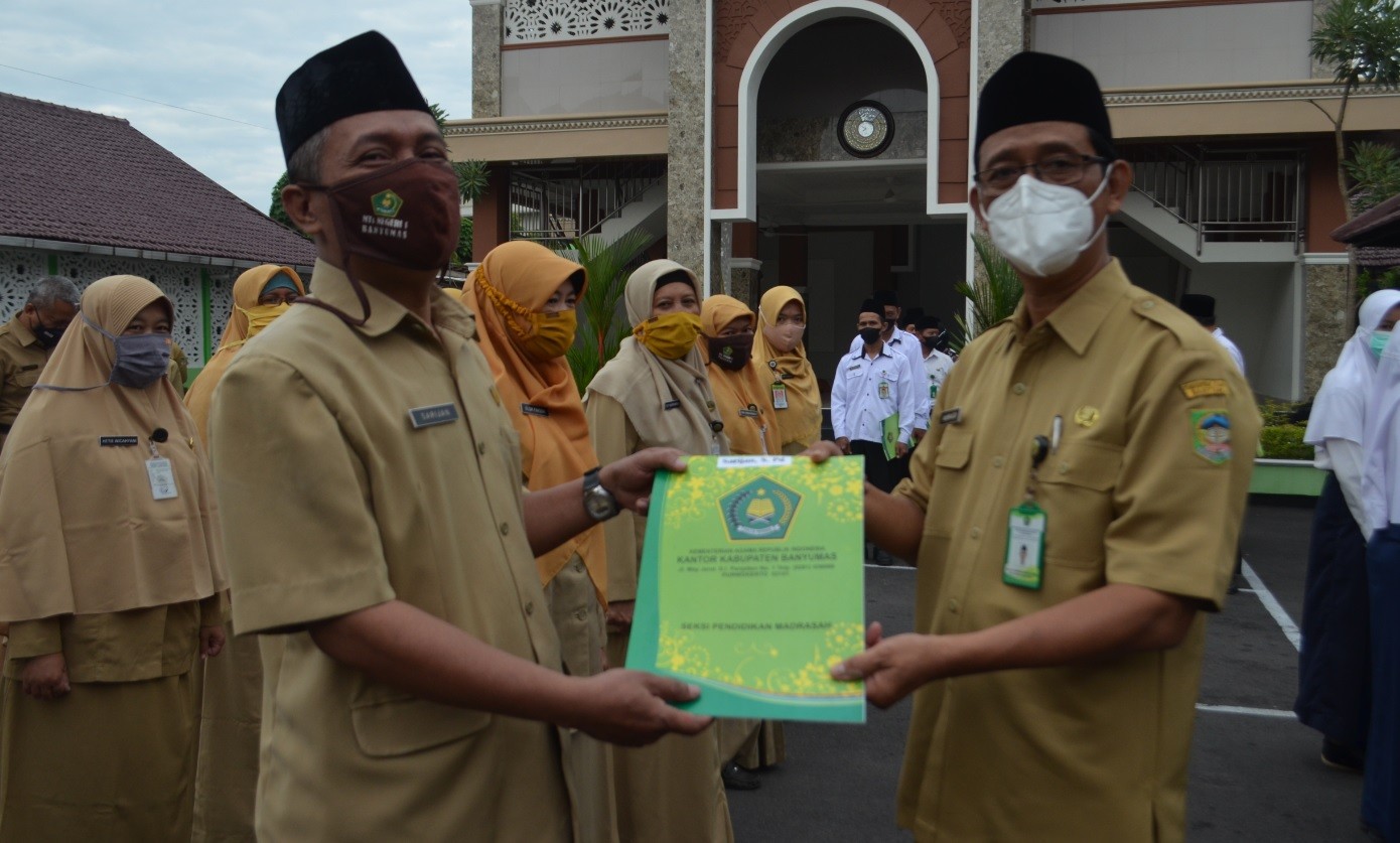 Purwokerto : Kepala Kantor Kemenag Banyumas Akhsin Aedi didampingi Kasubag TU dan para Kasi memberikan penghargaan kepada Sembilan orang guru MTs N 1 Banyumas yang telah berprestasi membina siswa – siswinya dalam ajang Kompetisi Sains dan Bahasa Nasional Tahun 2020 yang diselenggarakan oleh MTs N 1Pati bekerjasama dengan LP Ma’arif NU cabang Kabupaten Pati, Universitas Negeri Semarang dan Universitas Islam Nahdlotul Ulama (UNISNU) Jepara . Penyerahan penghargaan ini dilakukan di kantor Kemenag Banyumas pada saat pelaksanaan apel pagi. (Senin, 1/3)