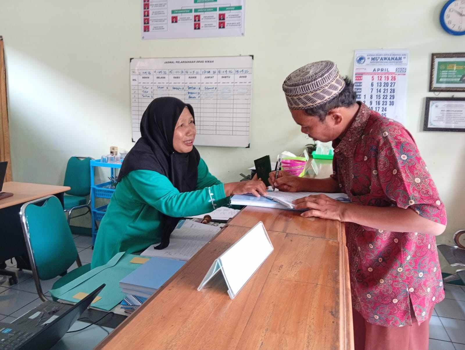 Banyumas - Kantor Urusan Agama (KUA) Rawalo terus berupaya meningkatkan kualitas pelayanan kepada masyarakat dengan menyederhanakan proses pengambilan buku nikah. Langkah ini dilakukan guna memberikan kemudahan akses serta memastikan pelayanan yang cepat, tertib, dan nyaman bagi warga. Pengambilan buku nikah hari ini diantaranya atas nama Tito Hermawan dan Vina Ismiatus Solihah dari Desa Sanggreman Kecamatan Rawalo. (Jumat 17/04)