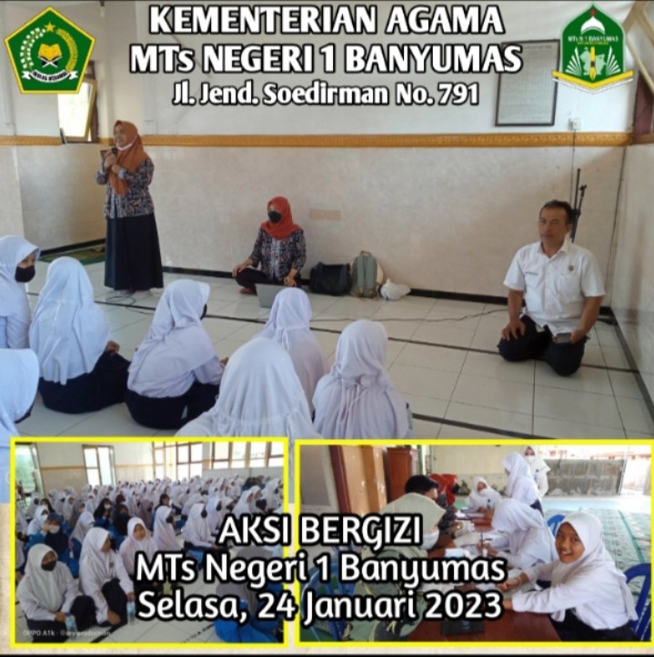 Aksi bergizi merupakan kegiatan untuk meningkatkan kesadaran masyarakat dan pelajar agar bisa menjaga kesehatan dengan baik dengan melakukan pemantauan dini terhadap kesehatan tubuh sehingga bisa dilakukan tindakan pencegahan dan pengobatan lebih awal terhadap penyakit yang diderita. Kegiatan Aksi Bergizi dilaksanakan pada hari Selasa, 24 Januari 2023 oleh petugas Puskesmas Purwokerto Timur 1, bertempat di serambi masjid Manbaul Ulum dengan peserta seluruh siswa putri kelas 7 pada pukul 09.00 s/d 11.00 WIB.