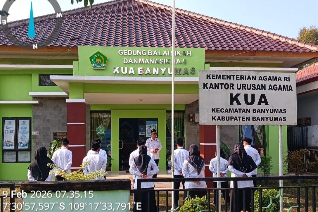 Banyumas — KUA Banyumas melaksanakan kegiatan apel pagi di halaman kantor pada Senin pagi. Kegiatan diikuti oleh seluruh pegawai dengan penuh khidmat sebagai bentuk penguatan disiplin dan komitmen kerja. Senin (09/02)