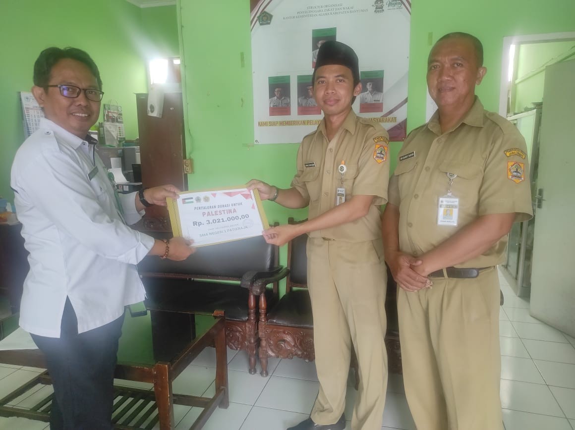 Purwokerto (Humas)- Penyelenggara Zawa Kantor Kementerian Agama Kabupaten Banyumas Faisal Riza menerima amanah donasi untuk Palestina dari SMAN 1 Patikraja sebesar Rp. 3.021.000,-. Donasi tersebut diserahkan oleh Imam Lathifuddin dan Aflahah Taufik, guru PAI SMAN 1 Patikraja mewakili Kepala Sekolah Noor Emma Rozillah. Senin (15/01)