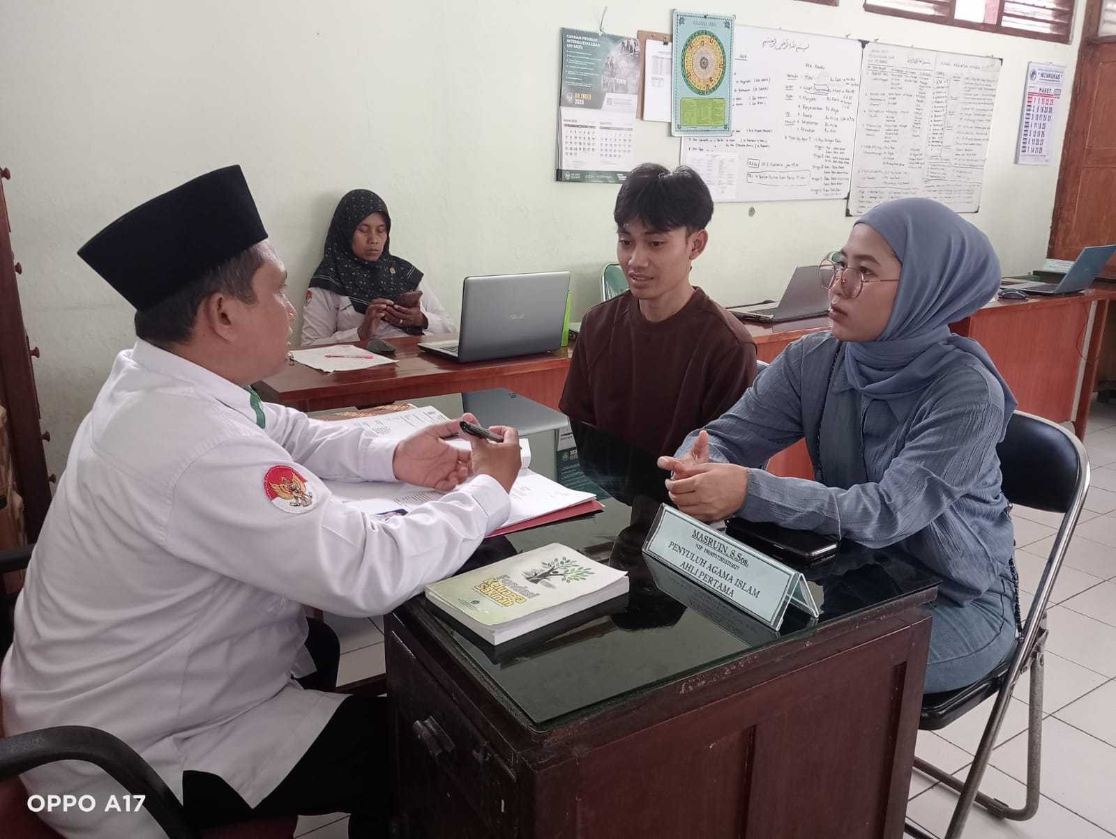 Banyumas - Kantor Urusan Agama (KUA) Rawalo terus berperan aktif dalam membekali calon pengantin (catin) melalui kegiatan Bimbingan Perkawinan (Bimwin). Dalam kegiatan Bimwin hari ini, KUA Rawalo memberikan pemahaman mendalam kepada catin atas nama Diva Singgih Analqi dari Desa Tambaknegara Kecamatan Rawalo dan Sautika Nur dari Jakarta yaitu tentang prinsip-prinsip dalam membangun keluarga sakinah, mawaddah, dan rahmah. (Selasa, 31/03)