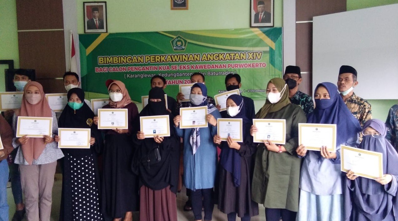 Banyumas : Program kegiatan Bimbingan Perkawinan (Bimwin)Pra Nikah Bagi Calon Pengantin Angkatan XIV KUA Se-Eks Kawedanan Purwokerto yang diselenggarakan di Gedung Balai Manasik Haji KUA Kec. Kedungbanteng ditutup secara resmi oleh Kepala KUA Kec. Karanglewas Muchlis, SHI yang sekaligus sebagai ketua panitia Bimwin dan didampingi oleh kepala KUA Kec. Kedungbanteng dan Baturraden, Kamis (2/12).