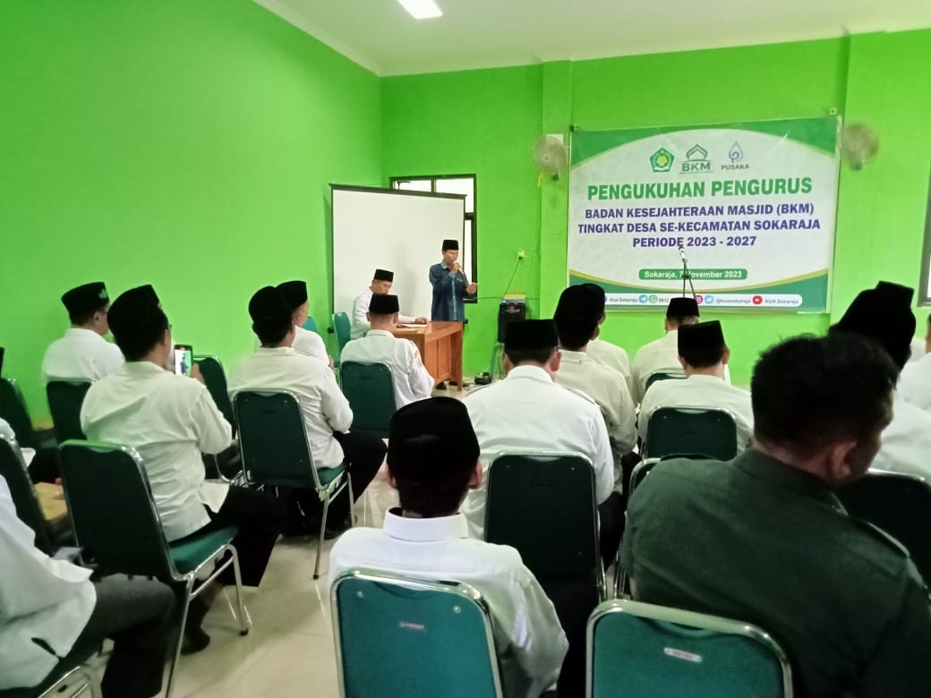 Purwokerto (Humas) : Pengurus Badan Kesejahteraan Masjid (BKM) tingkat desa se kecamatan Sokaraja dikukuhkan oleh Kepala kantor kementerian Agama Kabupaten Banyumas Ibnu Asaddudin, bertempat di aula kantor kecamatan Sokaraja. Selasa (07/11).