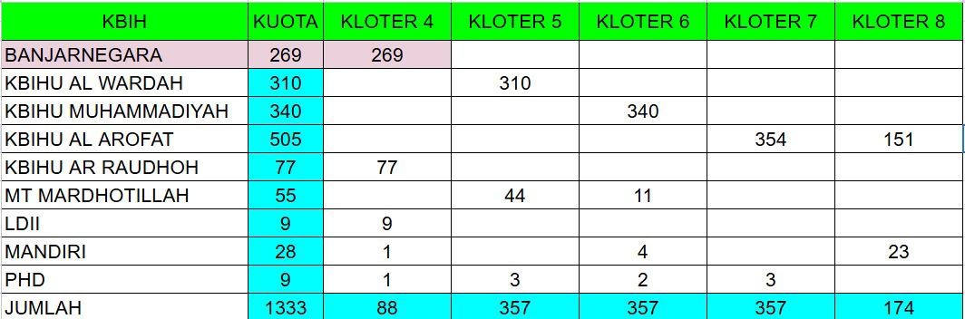 “ Calon jamaah haji dari Kabupaten Banyumas terbagi menjadi 5 kloter yakni kloter 4,5,6,7,dan 8 dengan jumlah total sampai hari terkahir adalah 1333 orang. Pembagian kloter tersebut sudah kami rapatkan bersama KBIHU dan pihak lain, sedangkan untuk jadwal pemberangkatan kami masih menunggu jadwal resmi dari menteri agama.” Ujarnya lebih lanjut.