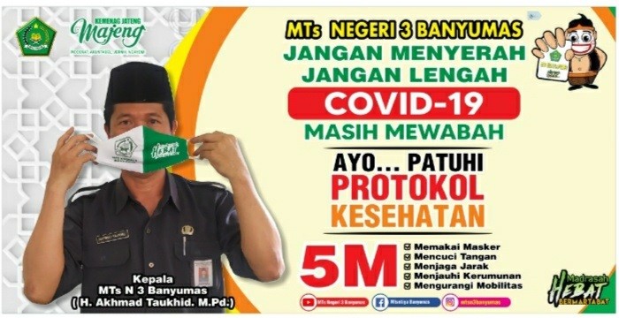 Sosialisasi ke siswa dan orangtua siswa mengenai 3M dan 5M sudah dilakukan oleh Waka Kesiswaan Riyadul Maki Aji M, S.Pd. dengan pembuatan Vidio kemudian dibagikan ke siswa dan orangtua siswa yang tergabung dalam POMG oleh para wali kelas. Dengan vidio tersebut diharapkan saatnya pembelajaran tatap muka siswa dan orang tua siswa sudah memahami dan terbiasa melaksanakan protokol kesehatan di madrasah.