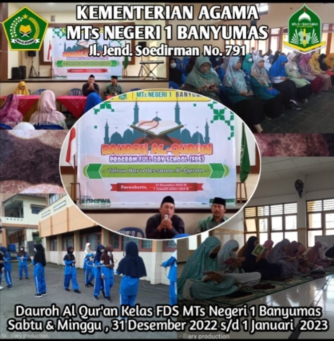 Al Qur'an merupakan pedoman hidup umat Islam sebagai petunjuk bagi umat manusia agar mengerti mana yang haq dan mana yang bhatil. Begitu pentingnya Al Qur'an terutama bagi generasi muda maka kelas FDS MTs Negeri 1 Banyumas mengadakan kegiatan daurah Al Qur'an pada hari Sabtu dan Minggu, 31 Desember 2022 sampai dengan 1 Januari 2023 bertempat di MTs Negeri 1 Banyumas, diikuti oleh siswa kelas FDS Tahfidz dan Sains.