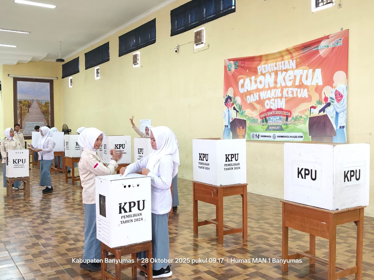 Banyumas, Humas — Semangat demokrasi kembali bergema di Aula Gelora Prestasi MAN 1 Banyumas. Pada hari Selasa, 28 Oktober 2025, seluruh peserta didik kelas X, XI, dan XII berpartisipasi dalam Pemilihan Ketua dan Wakil Ketua Organisasi Siswa Intra Madrasah (OSIM) yang digelar secara LUBER (Langsung, Umum, Bebas, dan Rahasia).