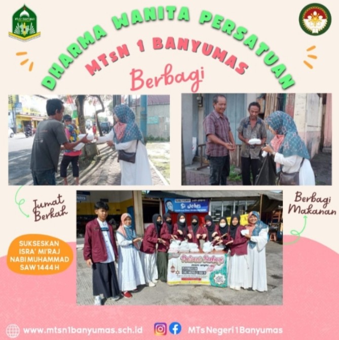 Salah satu bentuk program kerja Dharma wanita Persatuan MTsN 1 Banyumas adalah melaksanakan PHBI. Dalam pelaksanaan kegiatan peringatan hari besar Islam Isro Mi'roj Nabi Besar Muhammad Saw tahun ini, dharma wanita persatuan MTsN 1 Banyumas berkolaborasi dengan madrasah yaitu pada hari Jum'at, 17 Februari 2023. Anggota Dharma wanita Persatuan MTs Negeri 1 Banyumas secara langsung turun menyambangi masyarakat sekitar madrasah juga pengguna jalan dalam pembagian nasi bungkus .Semua anggota Dharma Wanita Persatuan MTs Negeri 1 Banyumas berbaur bersama siswa dalam kegiatan tersebut, dikandung maksud supaya terjalin interaksi rasa kekeluargaan para anggota DWP dengan para siswa sebagai dukungan moral dan semangat kebersamaan dalam memberikan sumbangsih yang berguna bagi keluarga besar MTs Negeri Banyumas dan Masyarakat.