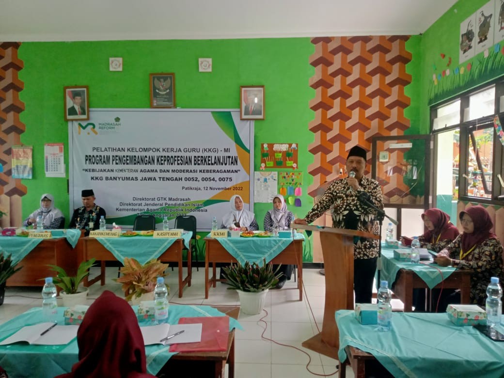 Program pelatihan yang bertema Kebijakan Kementerian Agama dan Moderasi Keberagaman dibuka oleh Kepala Kantor Kementerian Agama Kabupaten Banyumas H. Aziz Muslim, S.Ag, M.Pd.I sekaligus sebagai narasumber, didampingi oleh Kasi Pendma Edi Sungkowo, M.Pd, Pengawas Madrasah Ketua KKG MI Kecamatan Patikraja.