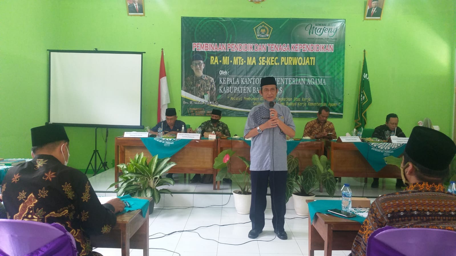 Banyumas : Kepala Kantor Kemenag Banyumas Drs. H. Akhsi, Aedi, M.Ag beserta Kasubag TU Ibnu Asaddudin dan Kasi Pendma Edi Sungkowo, Pengawas MI MTs kecamatan Purwojati Fuad Hasyim , Sunaryo pengawas MA kecamatan Purwojati menghadiri pembinaan bagi guru RA, BA, MI, MTs dan MA se kecamatan Purwojati , yang diadakan di gedung MWC NU kecamatan Purwojati, Jumat (29/10).