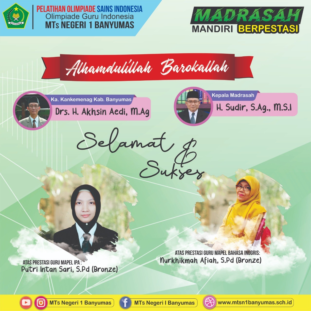 Purwokerto : Prestasi manis kembali diukir oleh MTs N 1 Banyumas , kali ini dalam ajang Olimpiade Guru Indonesia (OGI) yang digelar oleh POSI (Pelatihan Olimpiade Sains Indonesia), dimana pelaksanaan lomba dilakukan secara online. Nurkhikmah Afiyah, S.Pd Pd guru mapel Bahasa Inggris berhasil meraih Bronze Medal dan Putri Intan Sari, S.Pd. guru IPA berhasil meraih Bronze Medal. (Selasa, 5/10)