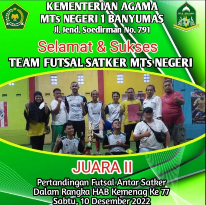 Dalam rangka HAB Kemenag ke 77 Satker MTs Negeri di Kabupaten Banyumas mengikuti berbagi perlombaan yang dilaksankan oleh Kantor Kemenag Kabupaten Banyumas salah satunya adalah pertandingan Futsal yang dilaksanakan pada hari Sabtu, 10 Desember 2022 bertempat di GOR Petro Dukuwaluh yang diikuti oleh seluruh Satker dibawah Kementerian Agama yang berjumlah 15 Team.