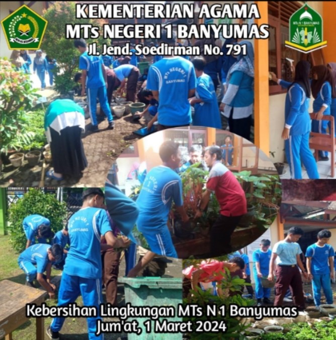 Hari ini, Jum'at 1 Maret 2024 MTs Negeri 1 Banyumas menyelenggarakan kegiatan kebersihan lingkungan dalam rangka menciptakan suasana belajar yang nyaman, indah sejuk dan asri. Kebersihan lingkungan MTs Negeri 1 Banyumas dilakukan oleh seluruh siswa kelas VII,VIII dan IX serta Bpk/Ibu Guru dan Staf Karyawan MTs Negeri 1 Banyumas.
