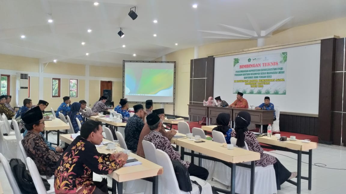 Purwokerto : Kakan Kemenag Kabupaten Banyumas H. Aziz Muslim , S.Ag, M.Pd.I didampingi Kasi Pendma Edi Sungkowo, M.Pd. Ketua KKM MA , Fasilitator Provinsi Lili Richati Chasanah, S.Pd, M.Si, membuka dan memberikan materi dalam Bimbingan Teknis Pengembangan Keprofesian Berkelanjutan (PKB) program bantuan Kelompok Kerja Madrasah berkelanjutan bagi Kepala Madrasah KKM MTs Banyumas 002 dan KKM MA 001 , di De Garden Resto. Kamis (10/11)