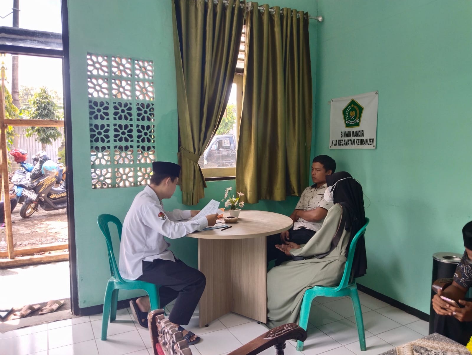 Kemranjen - Galih Lukman Hakim, Penghulu KUA Kemranjen, dikenal sebagai sosok penghulu muda yang penuh dedikasi dan tenaga dalam menjalankan tugasnya. Pukul 08.00 WIB, Galih melaksanakan pemeriksaan calon pengantin di ruang tamu KUA Kemranjen dengan semangat tinggi dan ketelitian luar biasa. Ia memastikan setiap berkas dan data calon pengantin lengkap serta valid, baik dari sisi dokumen negara maupun syariat Islam, agar tidak ada hambatan dalam pelaksanaan nikah nantinya. Selasa (14/04)