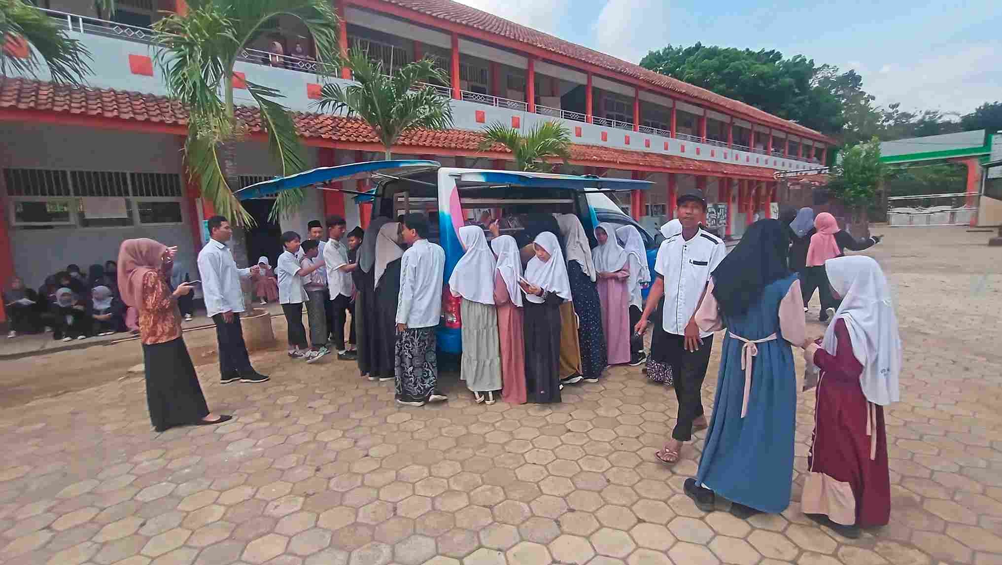 Banyumas (Humas): Mobil Perpustakaan Keliling (MOTALING) dari Perpustakaan Daerah Kabupaten Banyumas menambah kemeriahan Hari Santri Nasional yang digelar di MTsN 2 Banyumas. MOTALING yang hadir setelah kegiatan apel Hari Santri Nasional yang digelar di halaman depan MTsN 2 Banyumas disambut antusias oleh seluruh santri yaitu seluruh peserta didik MTsN 2 Banyumas, Selasa (22/10).