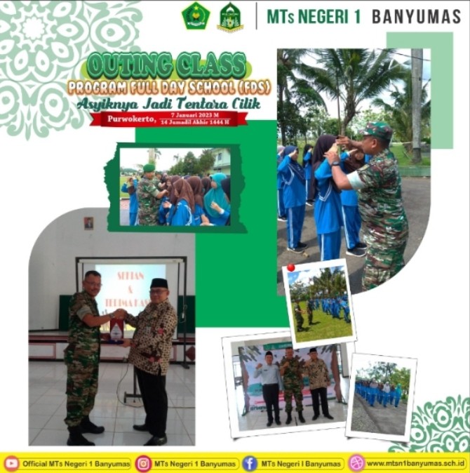 Program kemitraan MTs Negeri 1 Banyumas dengan TNI diwujudkan dengan pengiriman siswa FDS (Full Day School) ke Korem 071 Wijaya Kusuma pada kegiatan Outing Class dengan tema _"Asyiknya jadi tentara cilik_"pada hari Sabtu, 7 Januari 2023 pukul 07.30 s/d 13.00 WIB diikuti oleh seluruh siswa FDS Tahfidz dan Sains sejumlah 72 siswa dan para pendamping termasuk Kepala Madrasah, Waka Kesiswaan dan Koordinator kelas FDS Istikomah, S Pd.,M.Pd., dan Jihadul Mustafidz, S.M.