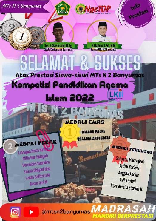 Banyumas - Siswa-siswi MTsN 2 Banyumas kembali Peroleh prestasi gemilang pada ajang Kompetisi Pendidikan Agama Islam 2022 yang diselenggarakan oleh LKI (Lembaga Kompetisi Indonesia) pada hari Minggu (13/2) secara online.