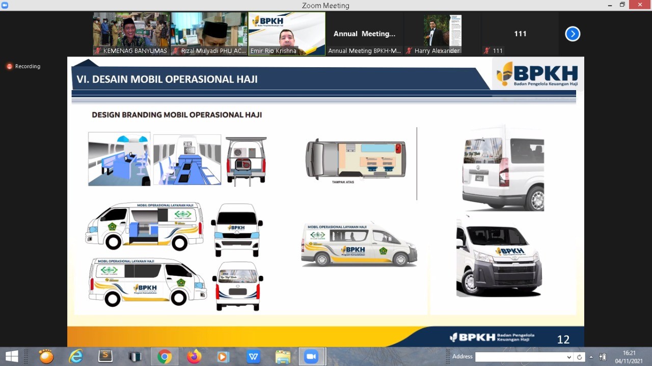 Purwokerto : Kantor Kemenag Banyumas akan mendapatkan bantuan mobil operasional layanan haji dari Badan Pengelola Keuangan Haji (BPKH) Kementerian Agama RI, kepastian tersebut didapatkan pada saat rapat dan pemaparan melalui zoom meeting yang dilakukan oleh BPKH dihadiri oleh Kepala kantor Kemenag Banyumas Drs.H.Akhsin Aedi, M.Ag serta didampingi Kasi PHU Purwanto Hendro P bersama dengan 6 kantor Kemenag kabupaten dan kanwil yang akan menerima bantuan tersebut, Kamis (4/11)