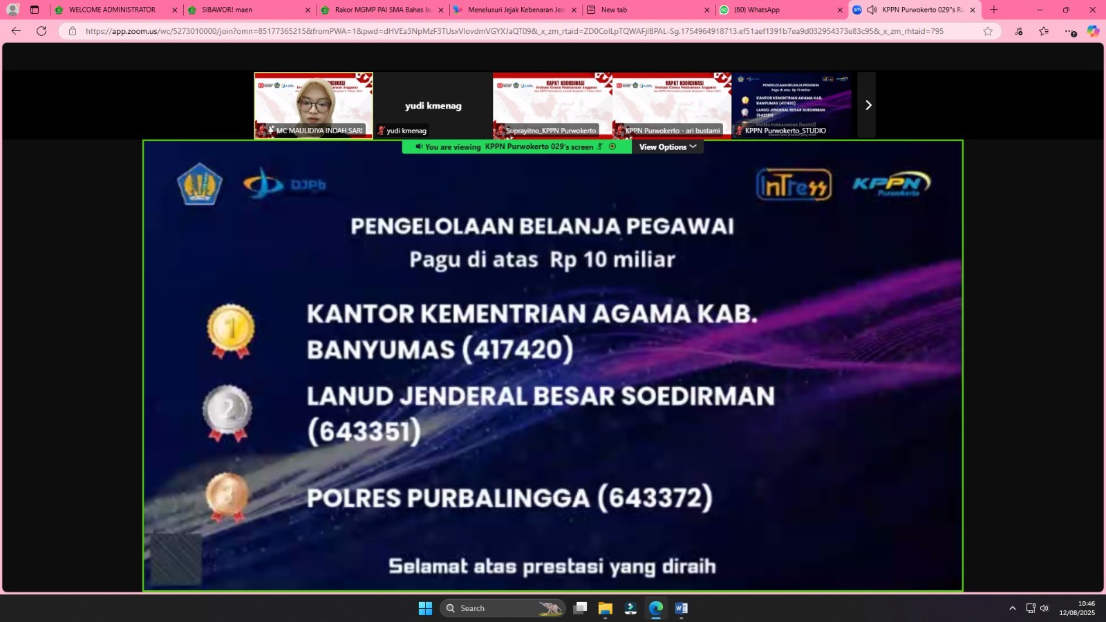 Purwokerto (Humas) - Kantor Kementerian Agama (Kemenag) Kabupaten Banyumas menunjukkan performa luar biasa dalam pengelolaan anggaran dengan meraih sembilan penghargaan di ajang “KPPN Purwokerto Awards” untuk Semester I Tahun 2025. Penghargaan ini diberikan dalam Rapat Evaluasi Kinerja Pelaksanaan Anggaran yang digelar secara daring melalui Zoom Meeting. Selasa (12/08)