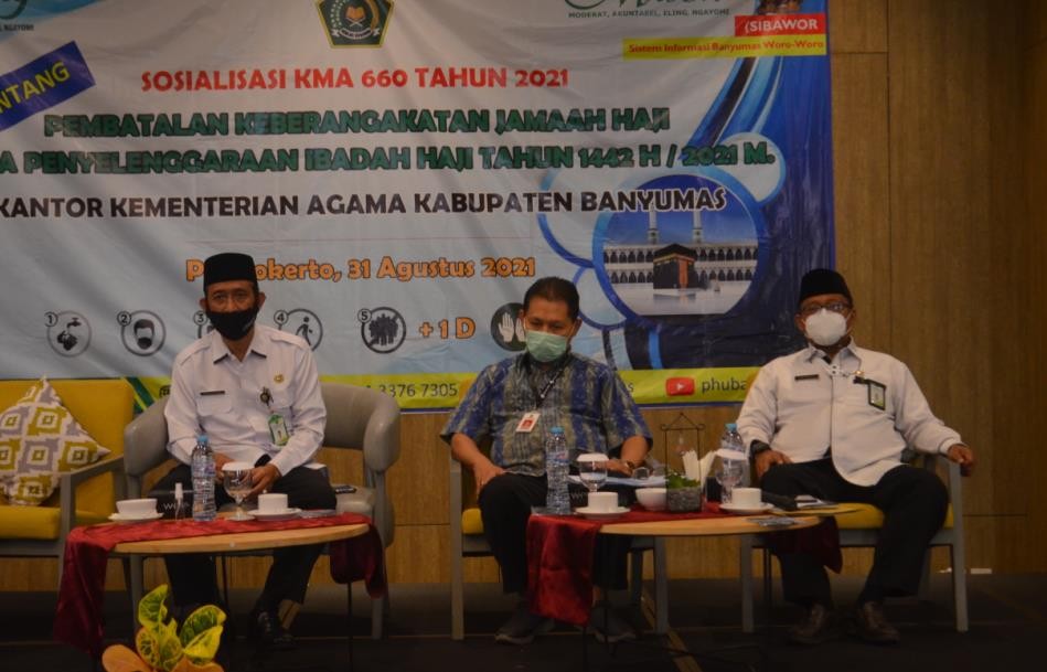 Purwokerto : Kantor Kemenag Kabupaten Banyumas melalui seksi PHU menggelar acara sosialisasi KMA nomer 660 Tahun 2021 tentang pembatalan keberangkatan jamaah haji pada penyelenggaraan ibadah haji tahun 2021. Sebagai narasumber Kepala Kantor Kemenag Banyumas Drs. H. Akhsin Aedi, M.Ag , Kepala Dinas Kesehatan Kabupaten Banyumas Sadiyanto, Ketua MUI Kabupaten Banyumas Taefur Arofat . Acara digelar di hotel Luminor Purwokerto dengan peserta perwakilan dari Kelompok Bimbingan Ibadah Haji (KBIH) di Banyumas secara terbatas (Selasa, 31/08)