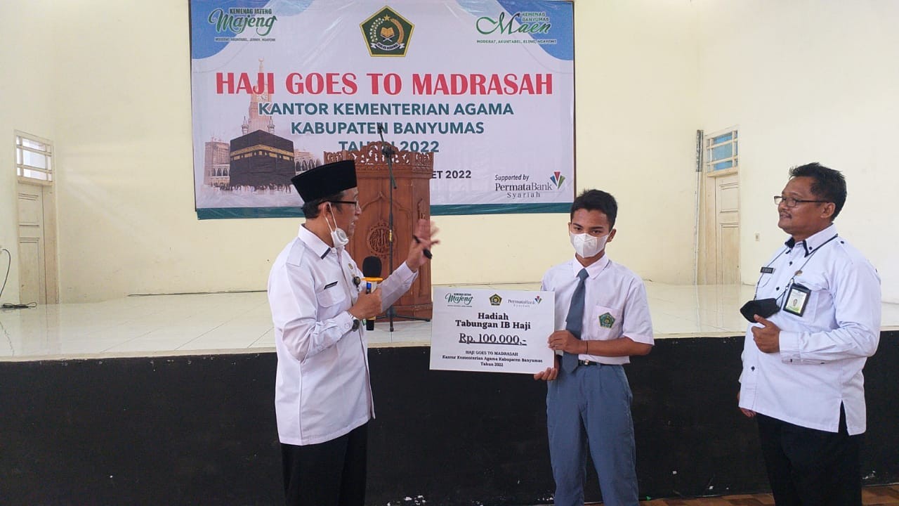 Kepala Kantor Kemenag Kab. Banyumas Drs.H.Akhisn Aedi,M.Ag didampingi Plt. Kasubag TU/Kasi PHU Drs. Purwanto Hendro Puspito, Kepala MAN 1 Banyumas Drs. Imam Sayoga.memberikan sambutan dalam acara penutupan Haji Goes To Madrasah, yang diikuti oleh 115 siswa-siswi kelas X di MAN 1 Banyumas. Senin (14/3)