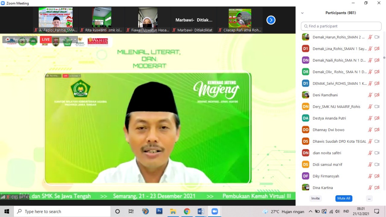 SEMARANG (Sibawor.id) – AGPAII, MGMP PAI SMA, SMK, Rohis Jawa Tengah menggelar kegiatan Kemah Rohis Virtual (KRV) III tingkat SMA/SMK se-Jawa Tengah. Kegiatan ini dibuka Kepala Kanwil Kementerian Agama Provinsi Jawa Tengah, H. Musta’in Ahmad (21/12/2021) melalui daring dan dihadiri sekitar 1.000 anggota Rohis dan guru pembina Rohis SMA/SMK se-Jawa Tengah.