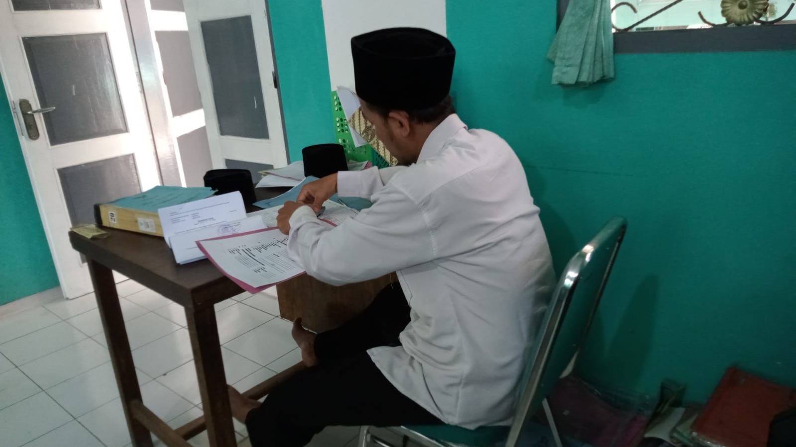 Dengan penuh ketelitian, Solehun melakukan pencatatan dan pengarsipan berkas pendaftaran Calon Pengantin (Catin). Satu per satu dokumen mulai dari formulir pendaftaran, fotokopi identitas, hingga surat pernyataan pendukung diperiksa kelengkapannya sebelum dimasukkan ke dalam map arsip digital maupun fisik.