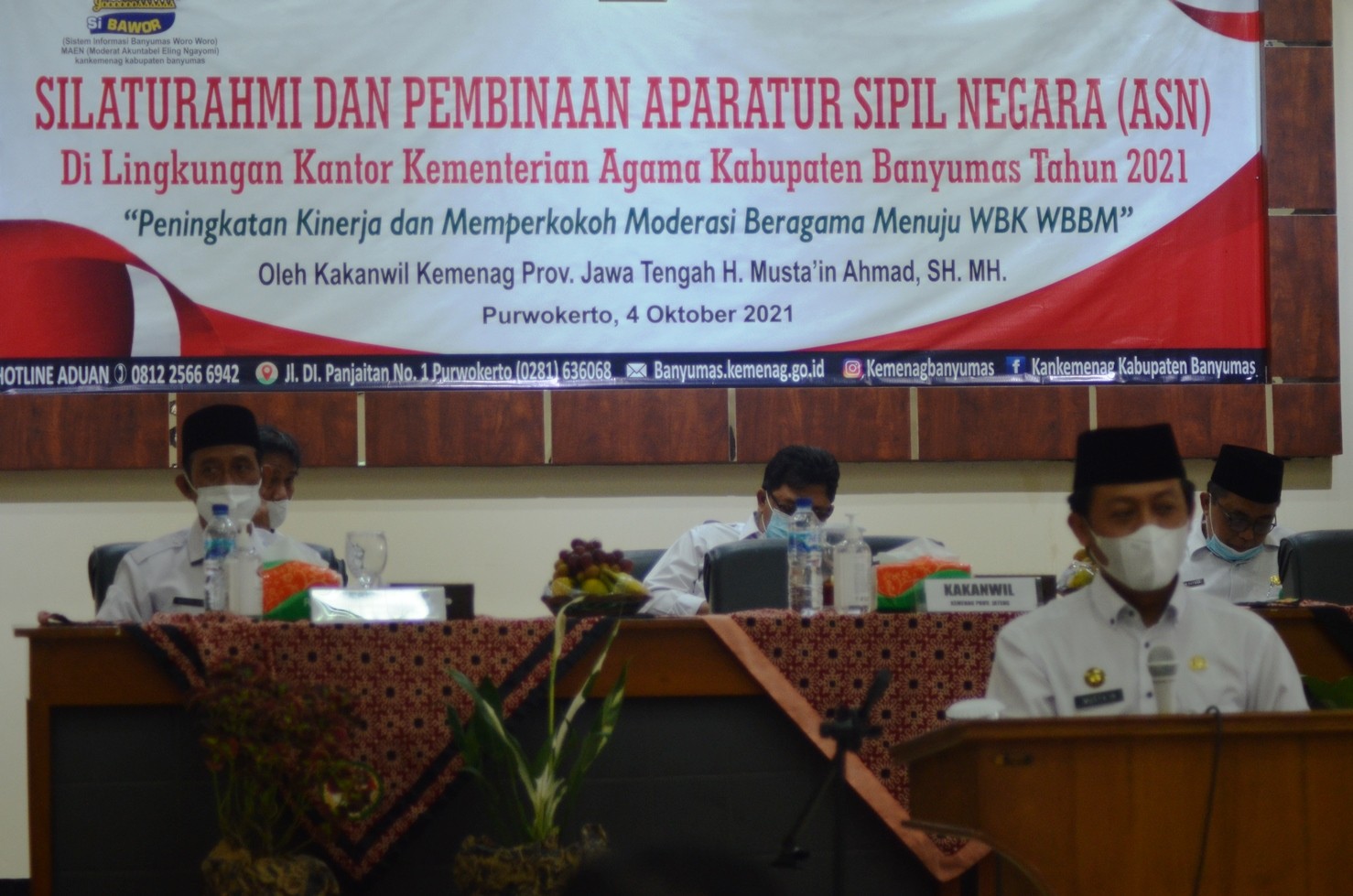 Oleh HUMASPurwokerto : Kepala kantor Wilayah Kementerian Agama Prov. Jawa Tengah H. Musta’in Ahmad, SH, MH didampingi kepala kantor Kemenag Banyumas Drs. H. Akhsin Aedi, M.Ag , Kasubag TU Ibnu Asaduddin, Kepala MIN, MTs N, MA N memberikan pembinaan kepada ASN di lingkungan kantor Kemenag Banyumas bertempat di Aula Al Ikhlas.(Selasa, 5/10)