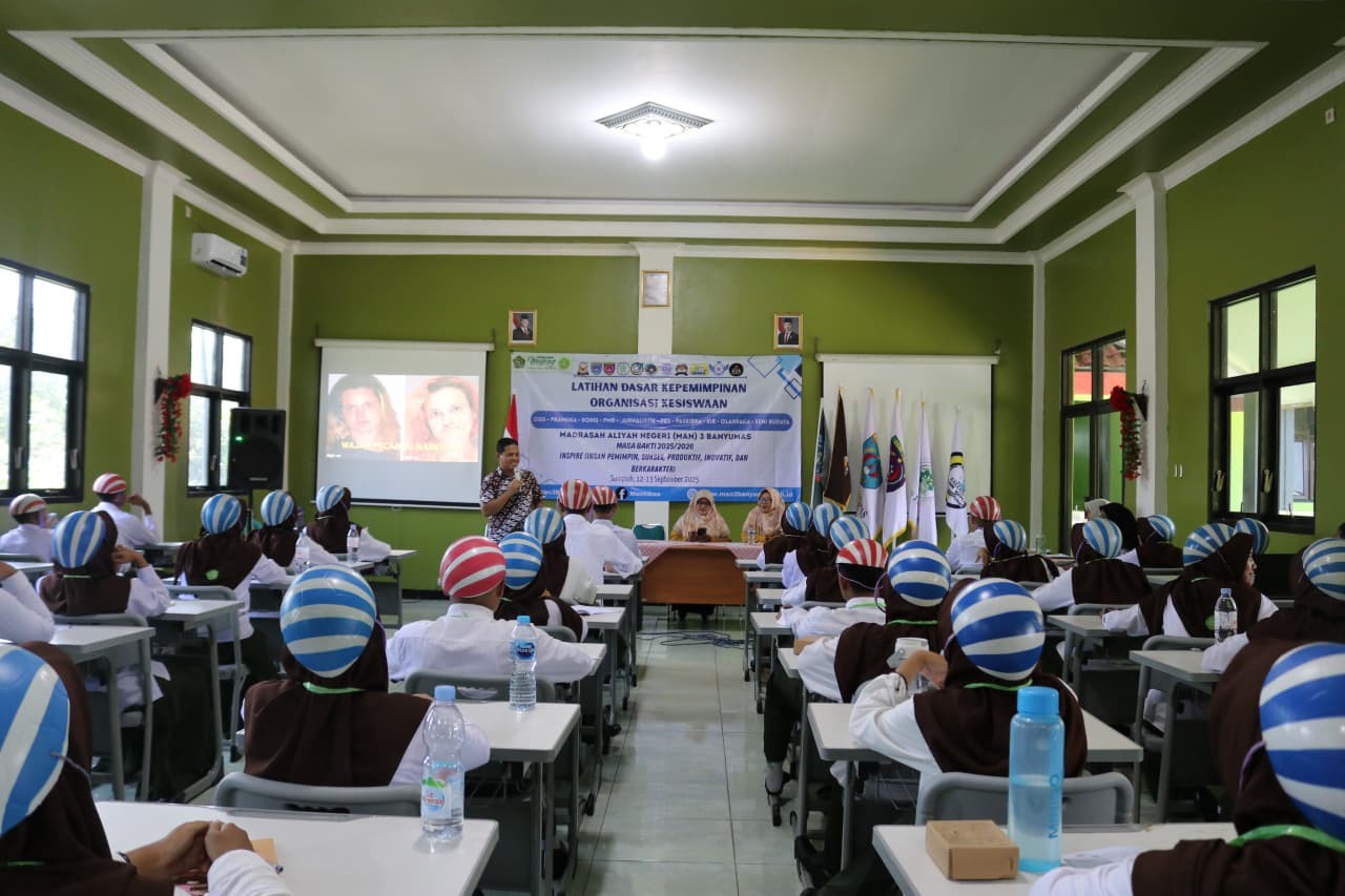 Banyumas - MAN 3 Banyumas melaksanakan kegiatan Latihan Dasar Kepemimpinan (LDK) Organisasi Kesiswaan pada Jumat-Sabtu, 12-13 September 2025. Kegiatan pembukaan LDK diikuti oleh Kepala Madrasah, Wakil Kepala Madrasah, dan pembina masing-masing organisasi kesiswaan di ruang rapat.