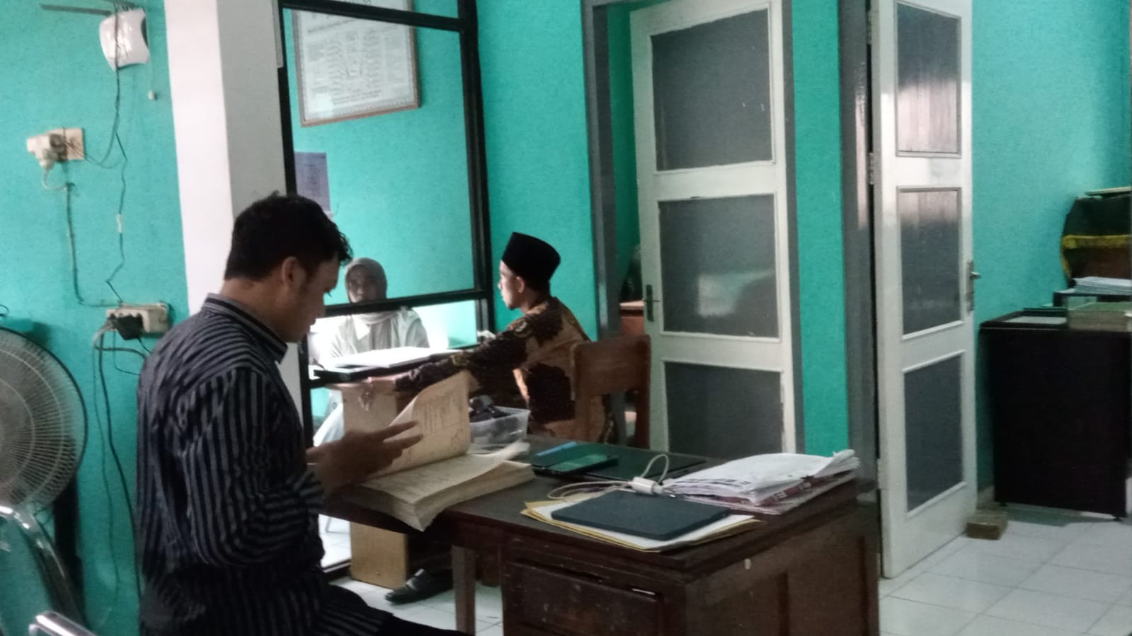 Sumpiuh – Staf Pelayanan Kantor Urusan Agama (KUA), Solehul, menerima kunjungan koordinasi dari perwakilan praktisi hukum (Asisten Advokat) di ruang pelayanan KUA. Kunjungan ini bertujuan untuk melakukan permohonan data kependudukan dan pencatatan nikah terkait pemenuhan berkas persidangan perkara perdata. Rabu (22/04)