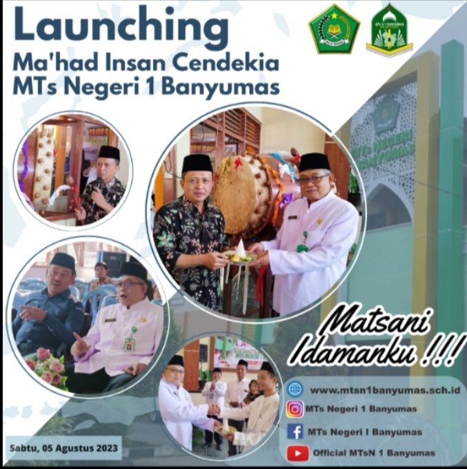 Ma'had atau pesantren merupakan impian yang sudah lama diharapkan oleh MTs Negeri 1 Banyumas. Seiring berjalanya waktu impian itu mulai terwujud, diawali dengan adanya program FDS (Full Day School) selama satu tahun. Sekarang MTs Negeri 1 Banyumas secara resmi telah mempunyai Ma'had atau pondok peantren Insan Cendekia yang telah di lounching pada hari ini, Sabtu, 5 Agustus 2023 oleh Kasi Pendidikan Agama H. Edi Sungkowo, S.Pd., M.Pd., yang sebelumnya juga telah ditinjau oleh Kepala Kantor Kementerian Agama Kabupaten Banyumas H. Ibnu Asaddudin, S.Ag., M.Pd.