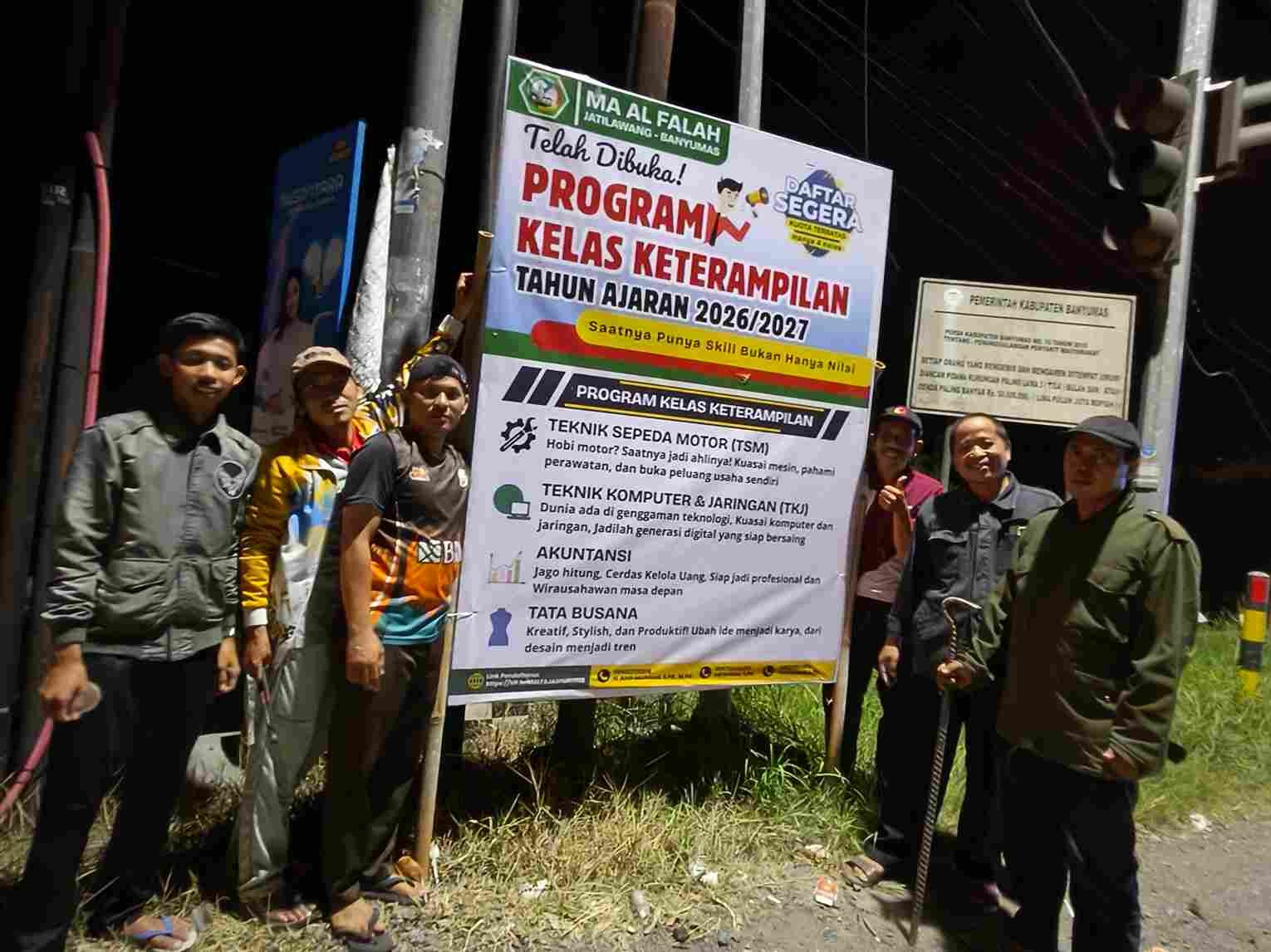 Banyumas – Madrasah Aliyah (MA) Al Falah Jatilawang terus berinovasi dalam menjaring minat calon peserta didik baru. Kali ini, pihak madrasah melakukan aksi "jemput bola" dengan memasang banner informasi pendaftaran dan keunggulan program keterampilan di berbagai titik strategis wilayah Banyumas bagian barat, meliputi Rawalo, Jatilawang, hingga Wangon. Sabtu (14/03)