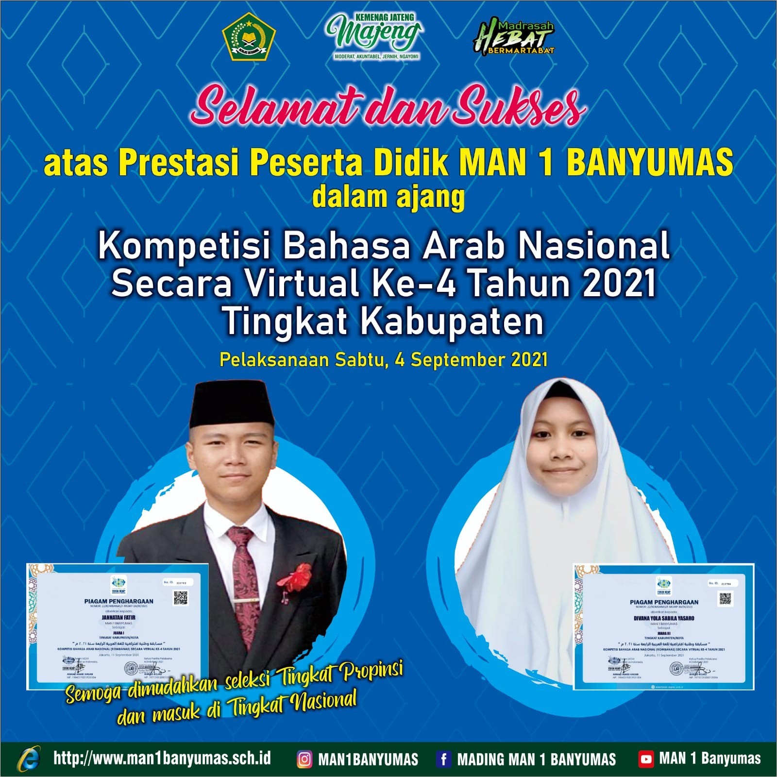 Purwokerto : Prestasi gemilang kembali diukir oleh siswa dari MAN 1 Banyumas yang berhasil merebut dua juara sekaligus yaitu Juara pertama oleh Jannatan Fatir kelas XI Keagamaan dan juara ketiga oleh Divana Yola Yasaro kelas XI Keagamaan, dalam Kompetisi Bahasa Arab Nasional tingkat kabupaten Banyumas yang diadakan tanggal 4 september dan diumumkan tanggal 11 September.(Senin,13/9)