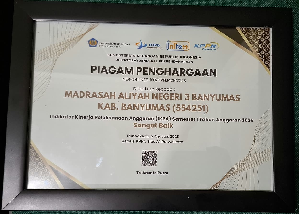 Pemberian penghargaan IKPA kepada MAN 3 Banyumas sebagai bentuk prestasi atas keberhasilannya dalam pengelolaan keuangan negara secara transparan dan akuntabel di semester 1 tahun anggaran 2025. Penghargaan pengelolaan IKPA merupakan salah satu penghargaan yang bergengsi dalam pengelolaan keuangan negara karena hanya didapatkan oleh tim keuangan yang berpredikat sangat baik. Keberhasilan ini merupakan penghargaan terbaik yang tidak lepas dari kontribusi semua pihak termasuk pengelola keuangan, pihak administrasi dan seluruh civitas akademik MAN 3 Banyumas.