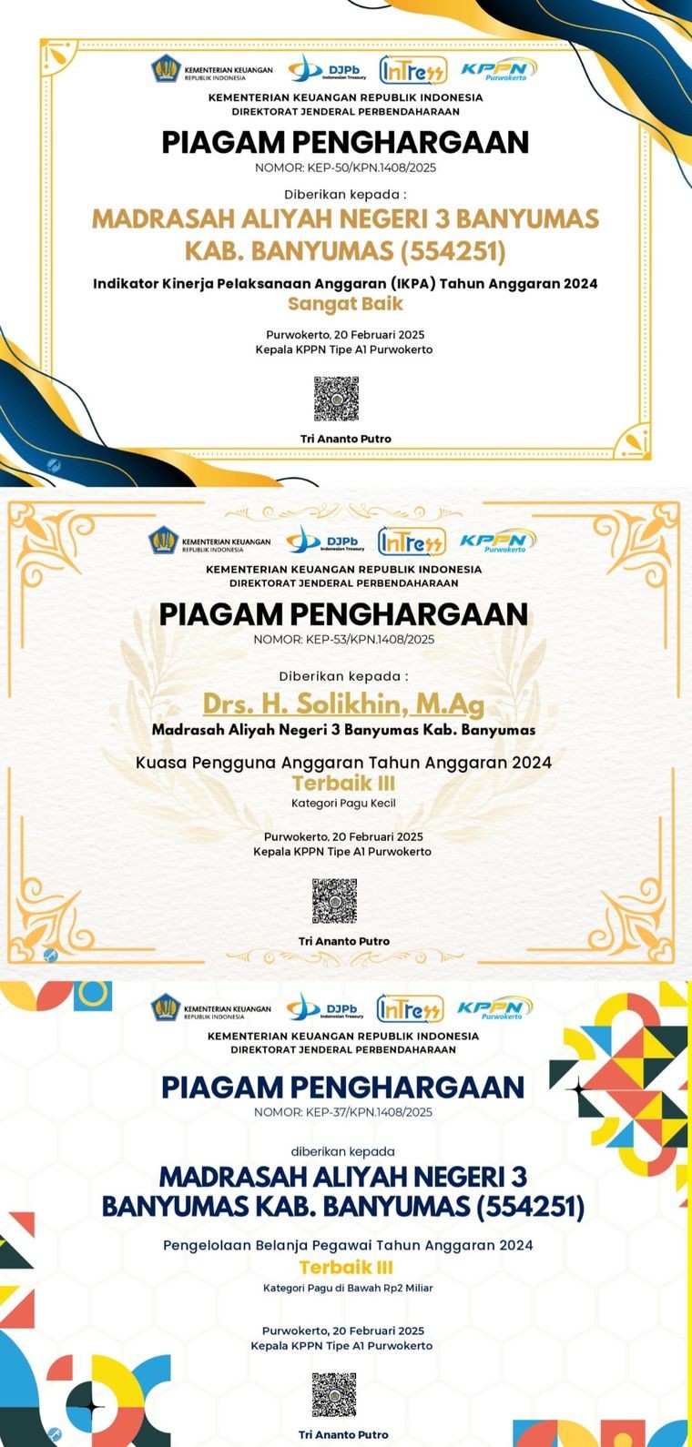 Keberhasilan ini merupakan penghargaan terbaik yang tak terlepas dari semua pihak termasuk pengelola keuangan, pihak administrasi dan seluruh civitas akademik MAN 3 Banyumas.