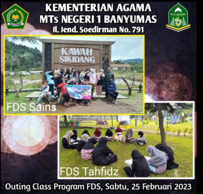 Pada hari Sabtu 25 Februari 2023, peserta didik kelas Sains IPS FDS (Full Day School) MTs Negeri 1 Banyumas dengan 2 orang guru pendamping mengadakan kegiatan Field Study Goes To Dieng Plateau serta Tadabur Al Qur'an di Taman Andang Pangrenan Purwokerto untuk kelas FDS Tahfidz.